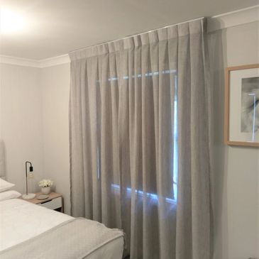 Both sheer and blockout fabrics are perfectly suited for this style, with pure linens and linen-look materials being among the most popular choices in our current collection. In a double-track setup, we recommend a reverse block pleat sheer on the front track paired with a gathered pencil pleat blockout on the back, allowing both curtains to glide effortlessly.